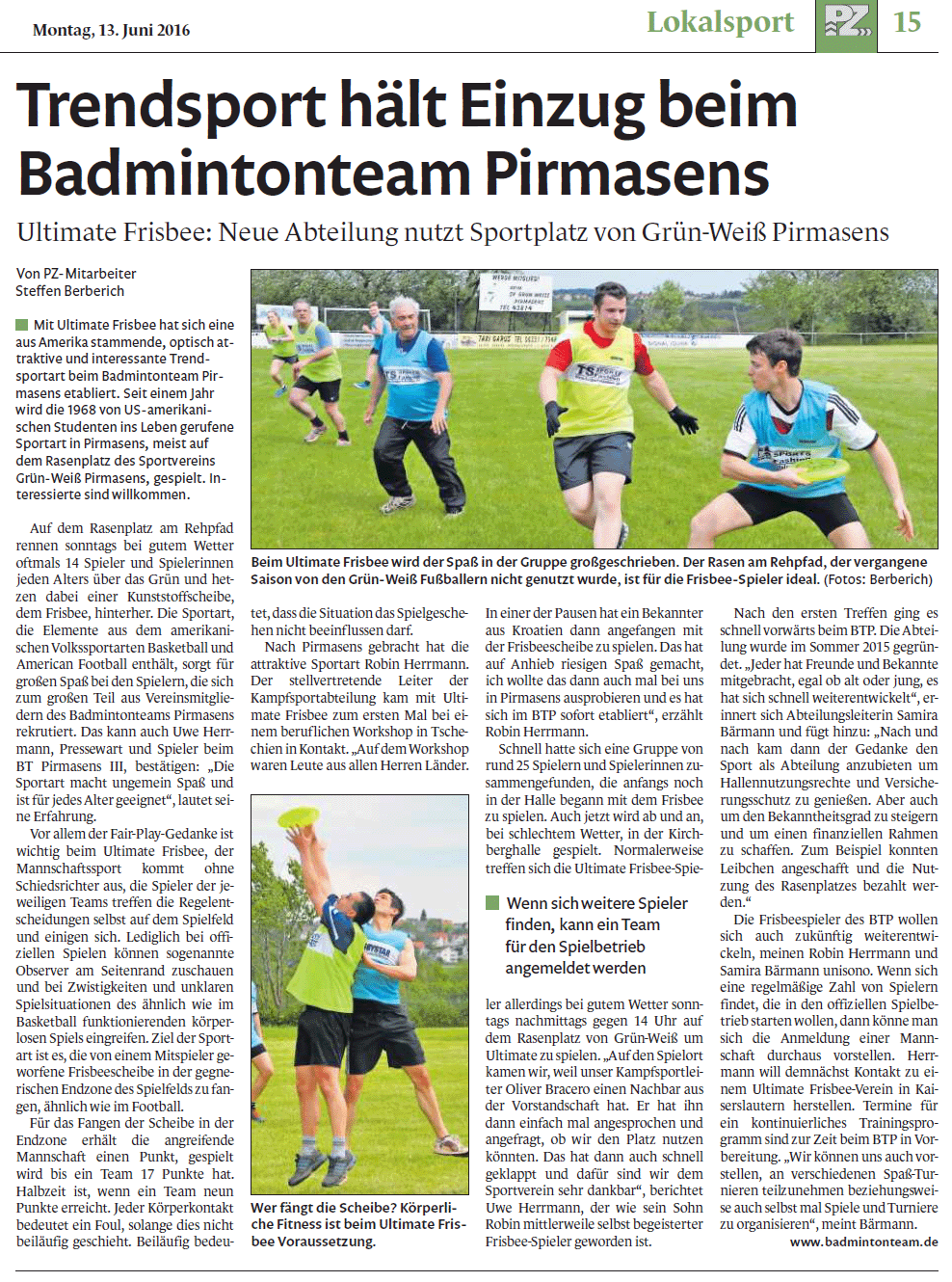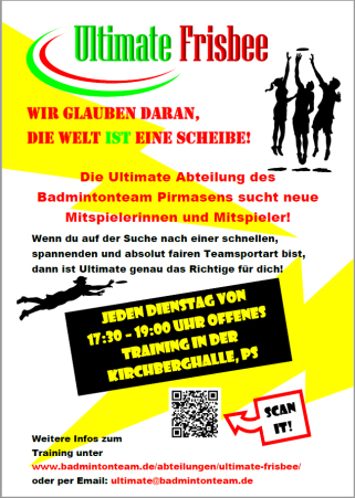 Nach den unverbindlichen Probestunden kannst du sicher beurteilen, ob dich das Ultimate Frisbee in seinen Bann gezogen hat, und ob du Mitglied in unserem Hauptverein Badmintonteam Pirmasens e.V.